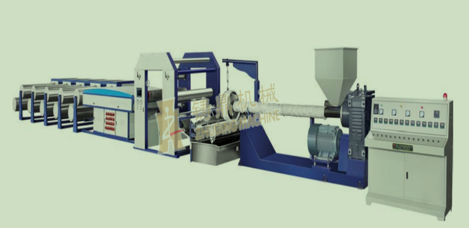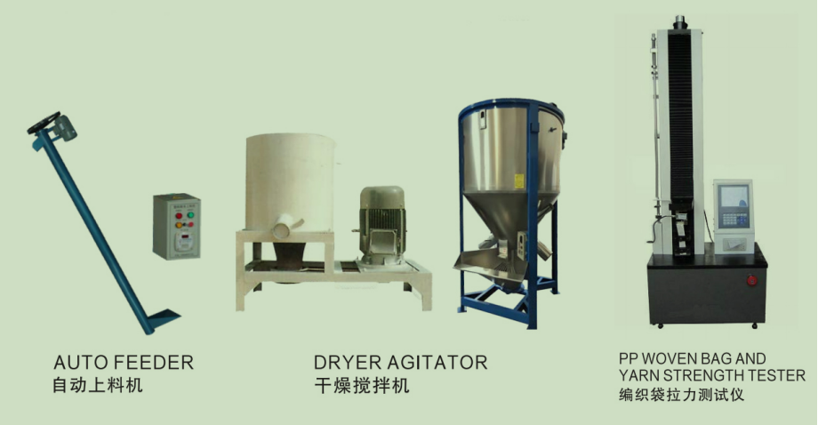and drawing makes tape that is then winded for the weaving of thecircular loom.Through our sustained improving ,the machine can use 100% regenerated PP & PE ,powder oigrain PP& HDPE to produce tapes .The screw and cylinder of extruder are of 38 CrMoAlA alloy steel.the hardness is over HV 950 after nitrogenation treatment. Helical gear reducer made of 20 CrMnTTially steel is applied to the extruder, the gears & chain wheels are made of 45# medium carbon steeland done the treatment of high frequency quench.The driving rollers are plated with hard Cr, tensionself-controlling of winding-rollers are applied to the driving unit.. The cylinder of extruder, triton anddie adopt aluminum cast heater which is endurable.